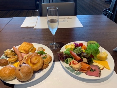 ですが、朝早くから作業していたホテルベーカリーの特製パンを楽しみに、私の2枚のお皿は超山盛りです。