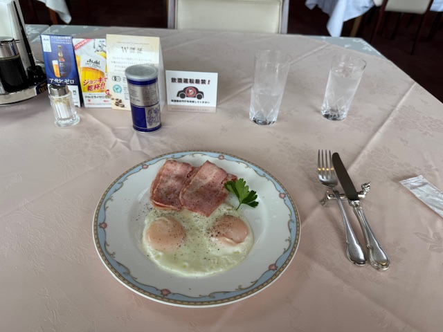 まずはレストランでベーコンエッグを食します。