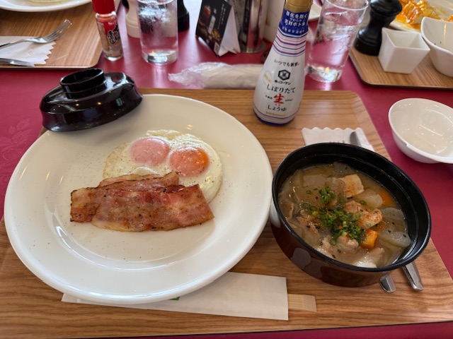到着後、レストランへ。今日も豚汁と目玉焼きベーコン乗せを食す。最高だね。