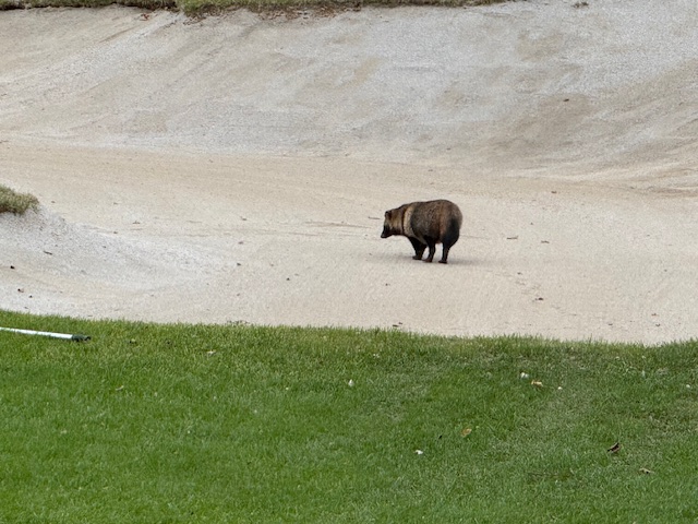 5番605yロングは、ドライバーは大きく右へ。PWで脱出、3wで残り170yへ。uで打つもチョロ。5オンからダボ。