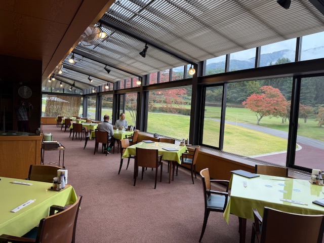 かがやきに乗り、長野駅で降りて、レンタカーに乗り、約1時間で穂高カントリークラブに到着。気温は11度でした。
