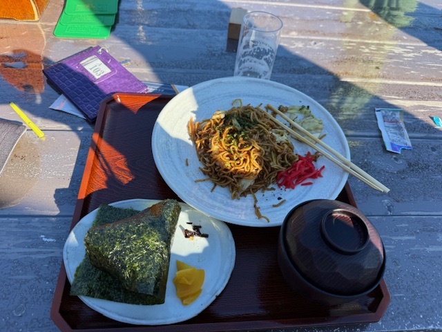 ランチは、テラスで焼鳥を6本と焼きそばとサラダを食す。雰囲気も最高で、味も美味いねー。