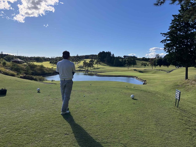 17番池越え160ヤードショート、ピンは池より左サイド。